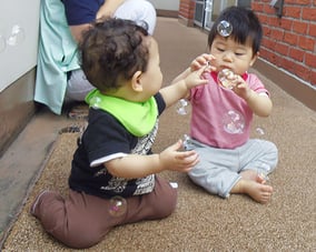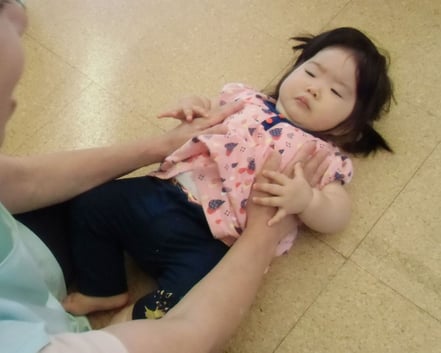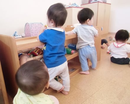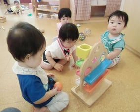 「食事・睡眠・排泄・着脱」といった育児面は担当制を導入、特定の大人との関わりを大切に、一日(24時間)の生活リズムを視野に入れ、基本的な信頼関係を作り、一人ひとりの個性を大切にしながら保育をすすめています。また、月齢や発達を考慮し、子どもの興味に適した玩具や保育者とのふれ合い遊び等を通して運動発達を刺激し、模倣活動が活発になるよう配慮しています。さらに、言葉やリズムの発達を促すために笑顔でのことばがけ、わらべうた等も日常の生活の中で丁寧に行っています。情緒的な絆も深まり、小グループの中で個々が気持ちよく過ごせるようにしていき、食事も離乳食から乳児食へ徐々に移行します。